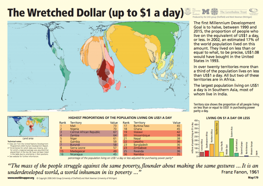 Main map image: territory size shows global wealth in 2015 (proportion of worldwide Gross Domestic Product measured in US$ equalised for purchasing power parity to be produced there).